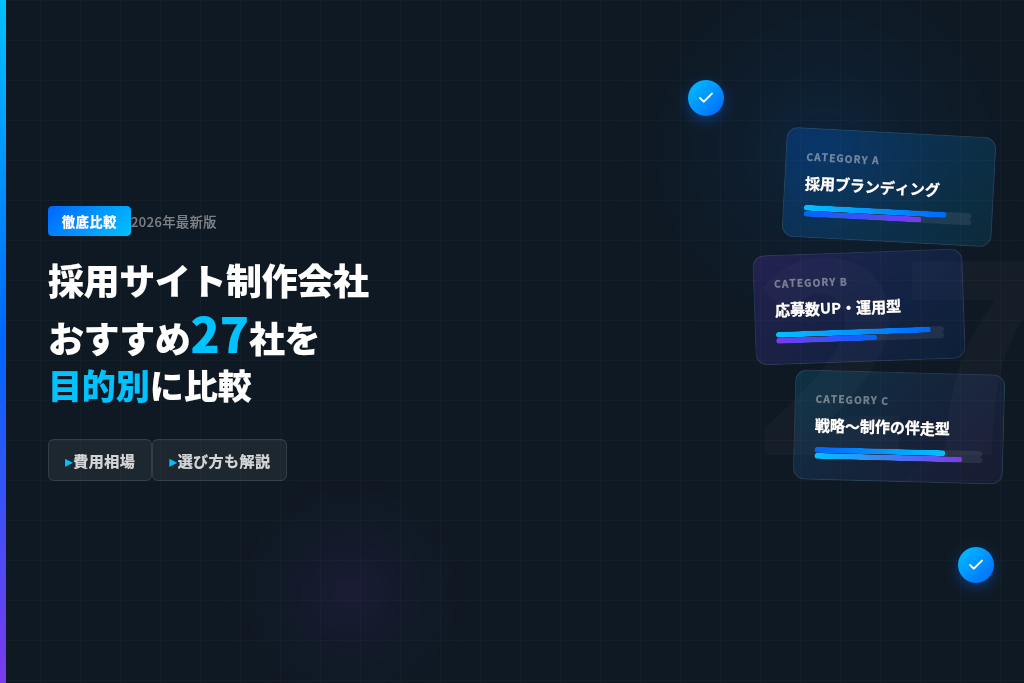 本記事では、対策KW「採用 サイト 制作 会社」の検索意図(制作会社の選定・比較、費用感、依頼前の整理、公開後の運用)に沿って、採用サイト制作会社を目的別に分類し、おすすめ27社を紹介します。