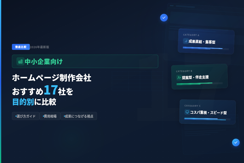 本稿は「中小企業のホームページ制作」を検討している方向けに、目的別に制作会社・支援会社を比較できるよう整理した原稿です。